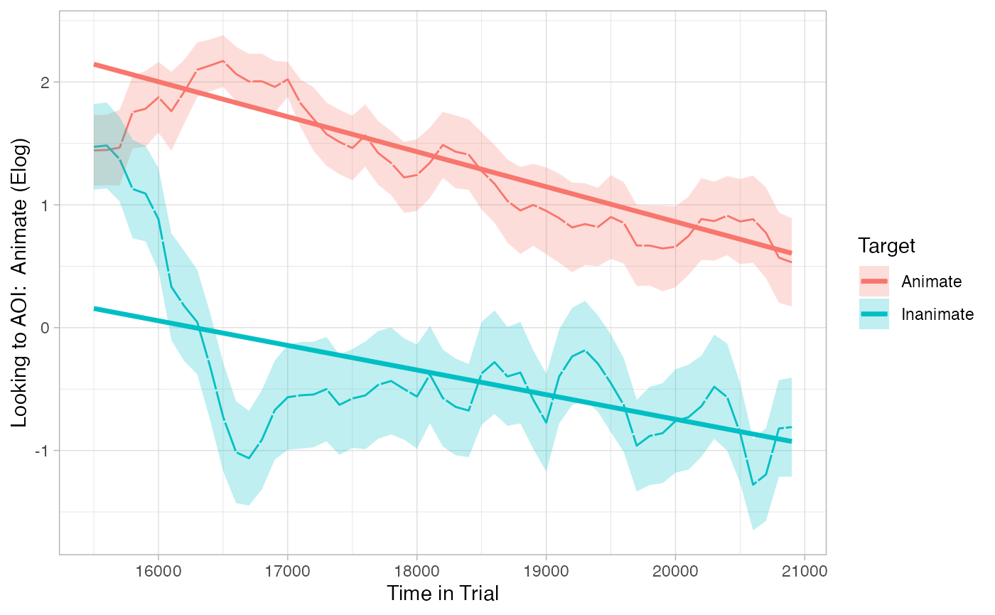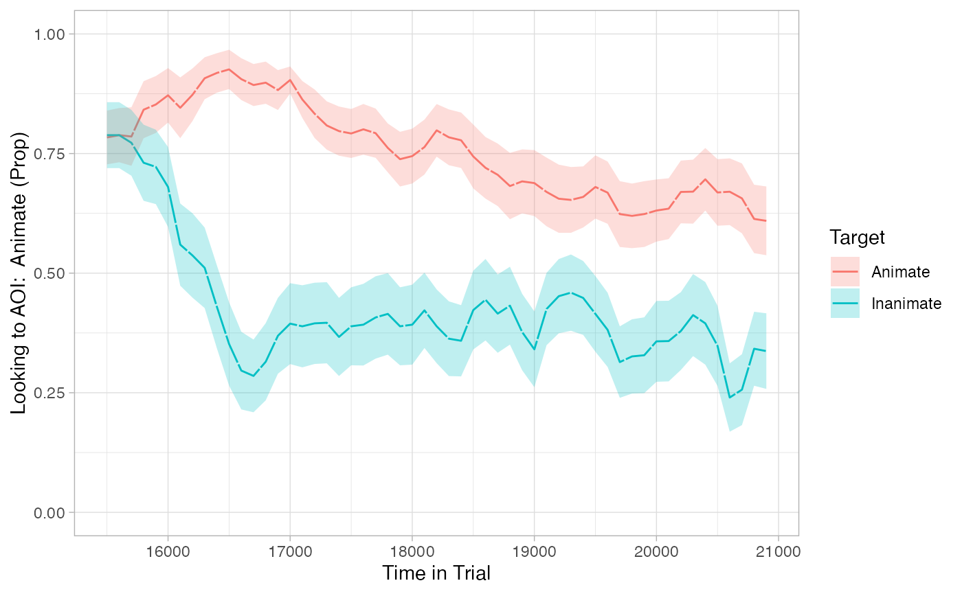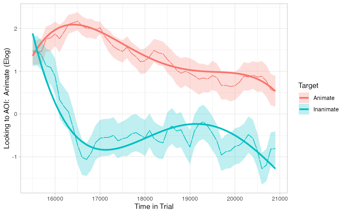 growth_curve_analysis_vignette.RmdOur Experiment: Each eyetrackingR vignette uses the eyetrackingR package to analyze real data from a simple 2-alternative forced choice (2AFC) word recognition task administered to 19- and 24-month-olds. On each trial, infants were shown a picture of an animate object (e.g., a horse) and an inanimate object (e.g., a spoon). After inspecting the images, they disappeared and they heard a label referring to one of them (e.g., “The horse is nearby!”). Finally, the objects re-appeared on the screen and they were prompted to look at the target (e.g., “Look at the horse!”).
