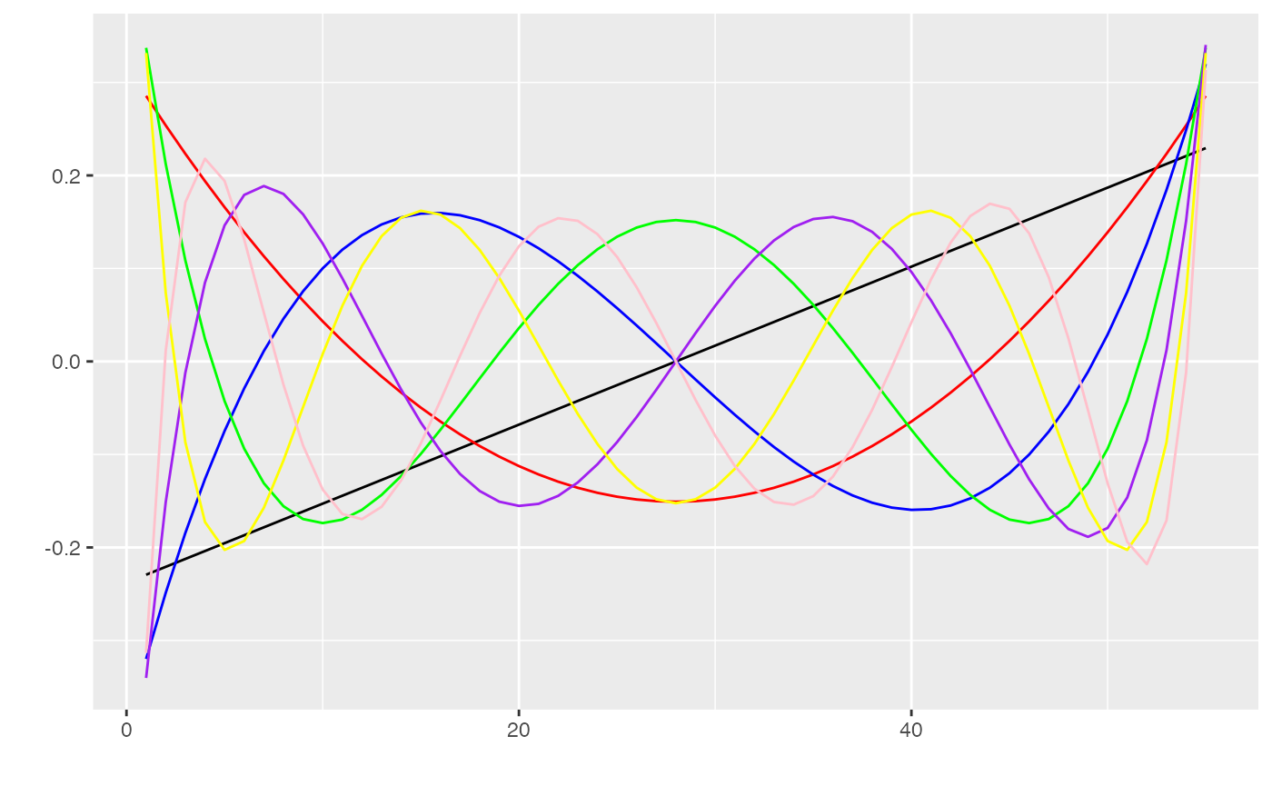 To remedy this issue, we can allow for non-linear change overtime by including a few higher-order orthogonal polynomials: