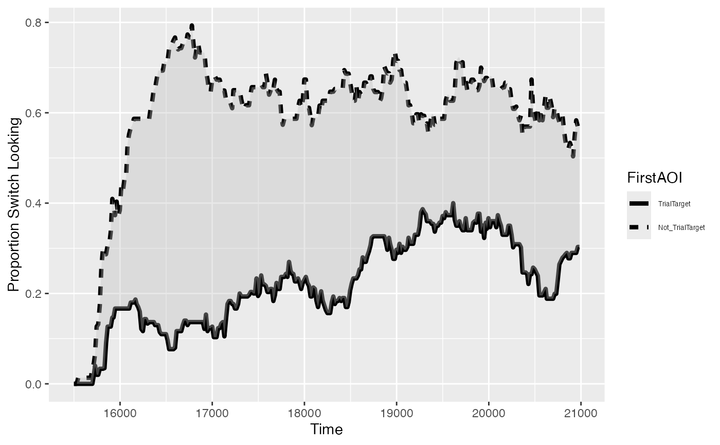 To do so, we can perform an onset-contingent looking analysis (e.g., Fernald et al., 2008), asking how quickly they switched from the AOI they were looking at from the onset of the trial when they happened to be looking at a non-target AOI. If participants were faster to switch from a distractor AOI to a target AOI than vice-verse, we can conclude that they were reliably identifying the target AOI.