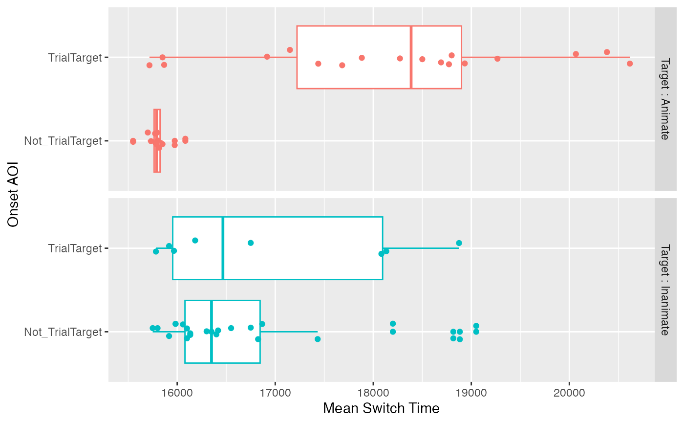 In this vignette, we want to examine how quickly participants’ looked to the referent AOI (e.g., the Animate, when the Animate was named; the Inanimate, when the Inanimate was named) – i.e., to calculate their reaction times.