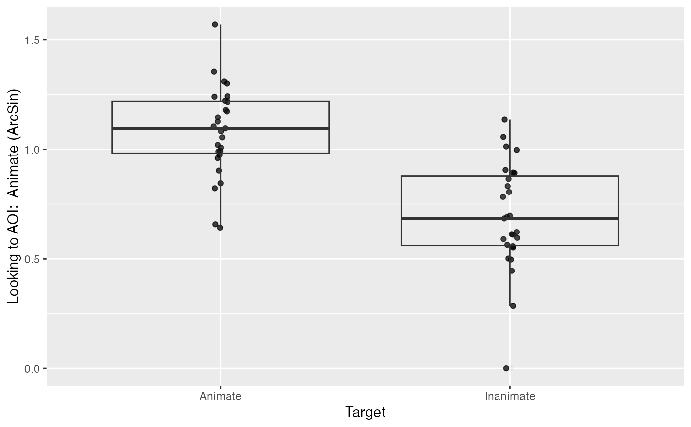 The first way to ask our question is to get a single mean proportion score (of looking to the Animate AOI) for each Target condition (Animate, Inanimate) for each subject and perform a paired t-test.
